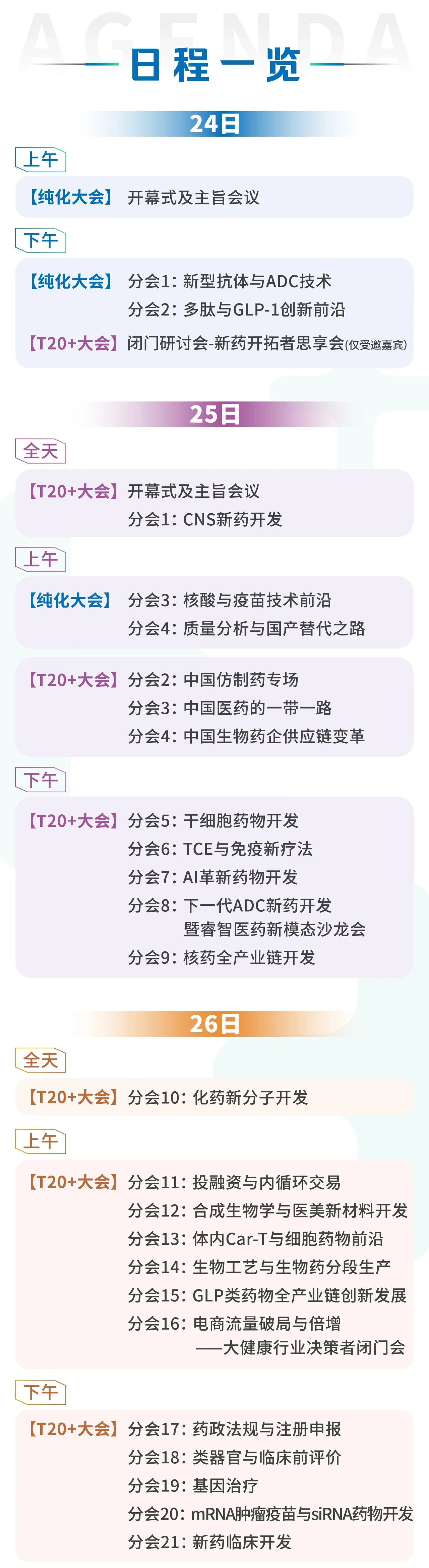 作为中国生物医药创新生态圈重要的思想交流和展示合作平台,同写意“T20+大会”将于7月24-26日在苏州金鸡湖凯宾斯基大酒店举办。本次大会以“站在科技前沿,寻找突破力量”为主题,设1场闭门研讨会、1场主旨会议和21场平行主题分会,150+业内参展企业、200+深度前沿议题、300+药企董事长/CEO/创始人/总裁出席。