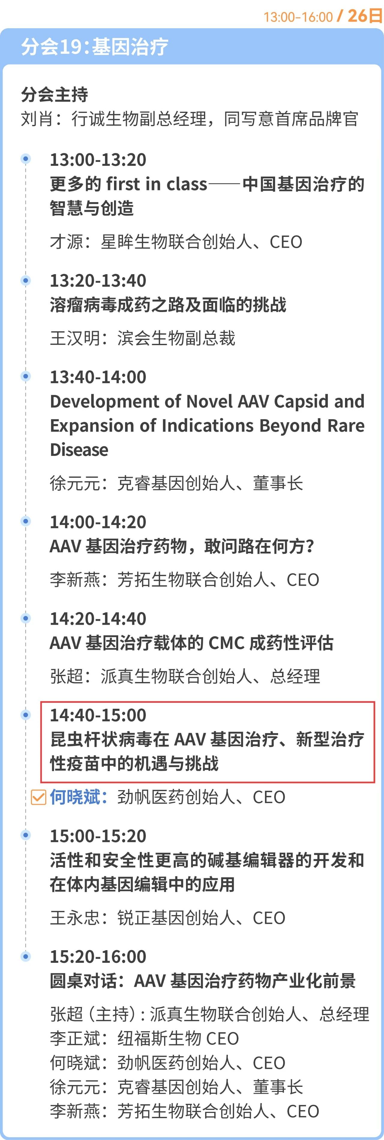 劲帆医药CEO何晓斌博士,将于7月26日下午14:40-15:00在基因治疗分会场为大家分享“昆虫杆状病毒在AAV基因治疗、新型治疗性疫苗中的机遇与挑战”的主题演讲。届时热烈欢迎同仁莅临指导交流!