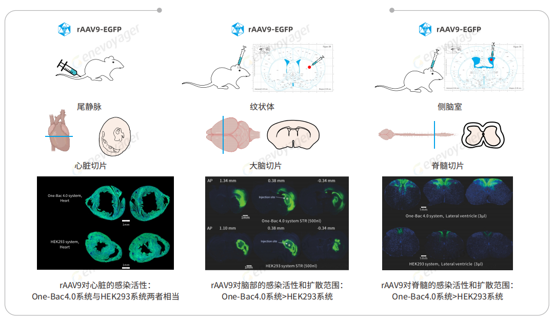 细胞及动物实验结果表明,One-Bac4.0系统生产的rAAV感染效果媲美甚至优于HEK293系统。