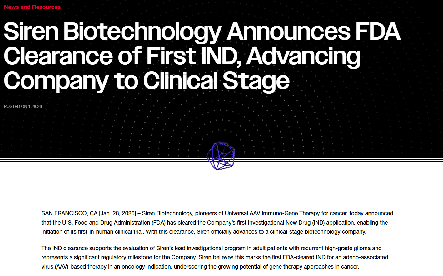 1月28日,通用型AAV免疫基因疗法研发公司Siren Biotechnology宣布FDA通过其用于治疗成人高级别胶质瘤(HGG)的AAV免疫基因疗法SRN-101的研究性新药(IND)申请。这标志着该疗法成为世界首款通过IND批准的用于治疗肿瘤的在研AAV基因疗法,凸显了AAV基因疗法在癌症治疗领域日益增长的潜力。
