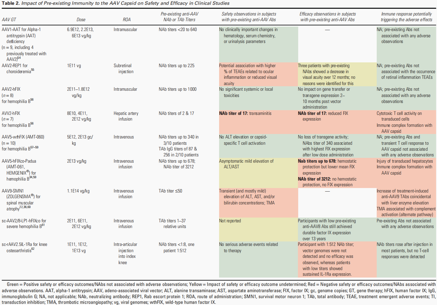 表2 AAV 衣壳预存免疫对临床试验中安全性与有效性的影响