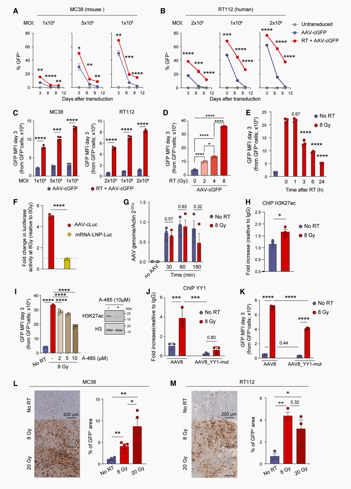 体外实验:经8Gy放疗的小鼠MC38结直肠癌细胞、人类RT112膀胱癌细胞,被AAV-cGFP(表达绿色荧光蛋白)转导后,GFP阳性细胞比例和荧光强度均显著高于未放疗组,且这种增强效果具有剂量依赖性——放疗剂量越高,转导效率越强;
