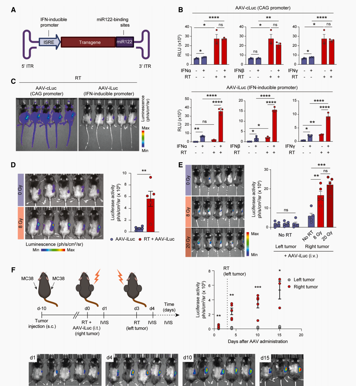 体外实验:显示仅在放疗+IFN刺激的情况下,AAV-iLuc(表达荧光素酶)才能产生强烈的荧光信号,未放疗或未受IFN刺激的细胞中,转基因几乎不表达;