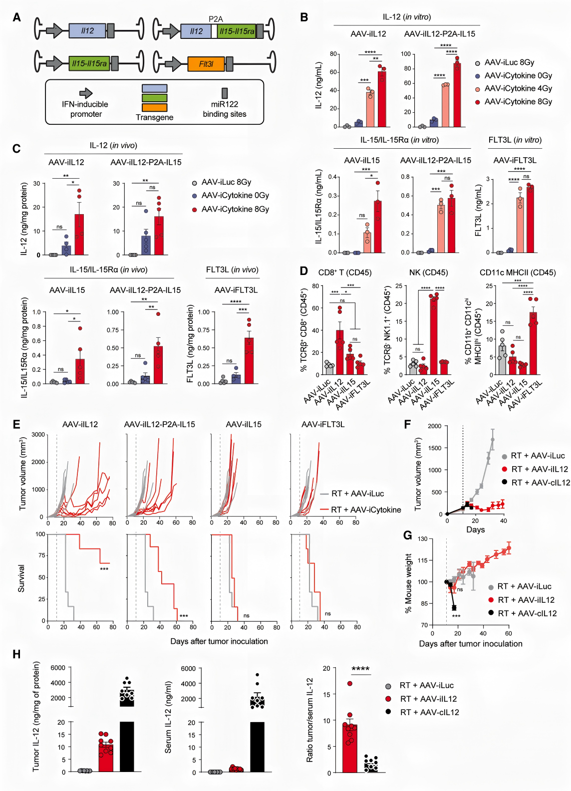 基于放疗对AAV的激活作用,研究团队设计了IFN诱导型AAV平台,核心目标是实现细胞因子在肿瘤局部的“精准、可控”表达,避免全身性毒性(见图2)。