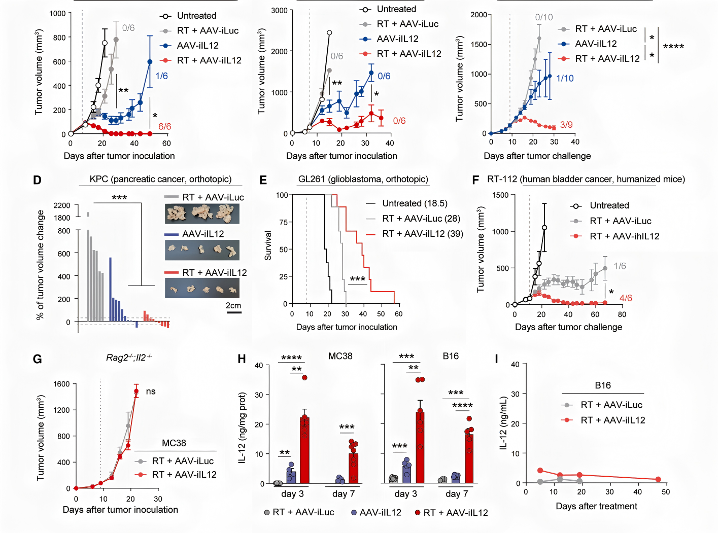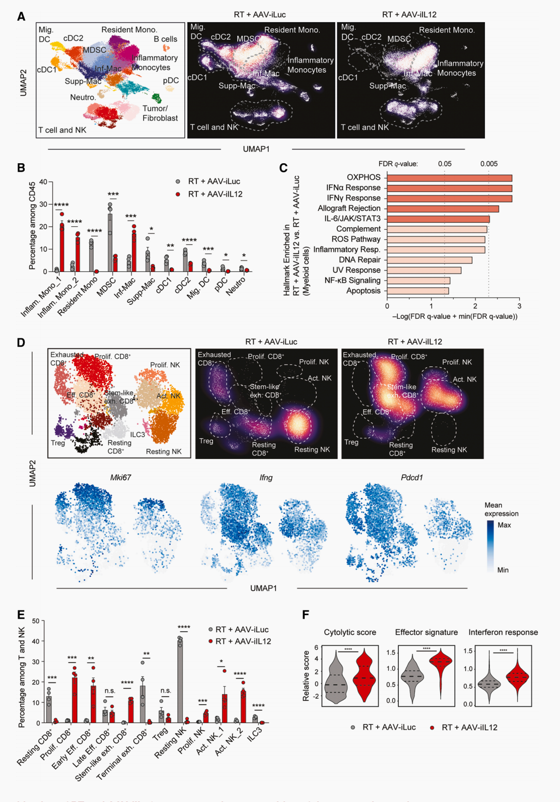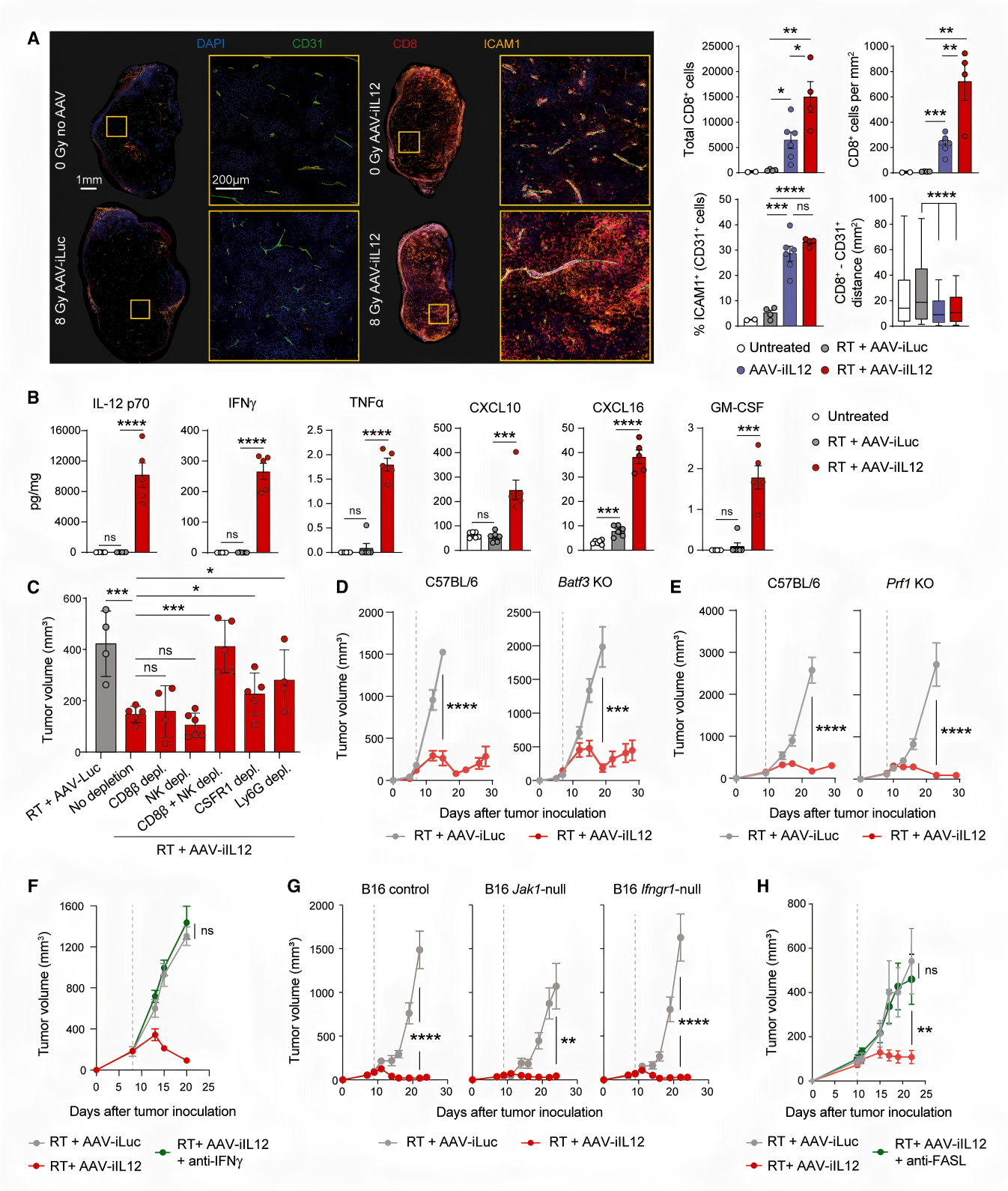 FAS/FASL通路是关键执行环节:放疗+AAV-iIL12能诱导肿瘤细胞高表达FAS,同时激活CD8⁺T细胞、NK细胞表达FASL,通过FAS/FASL结合诱导肿瘤细胞凋亡;阻断FASL后,疗法的抗瘤效果显著减弱;