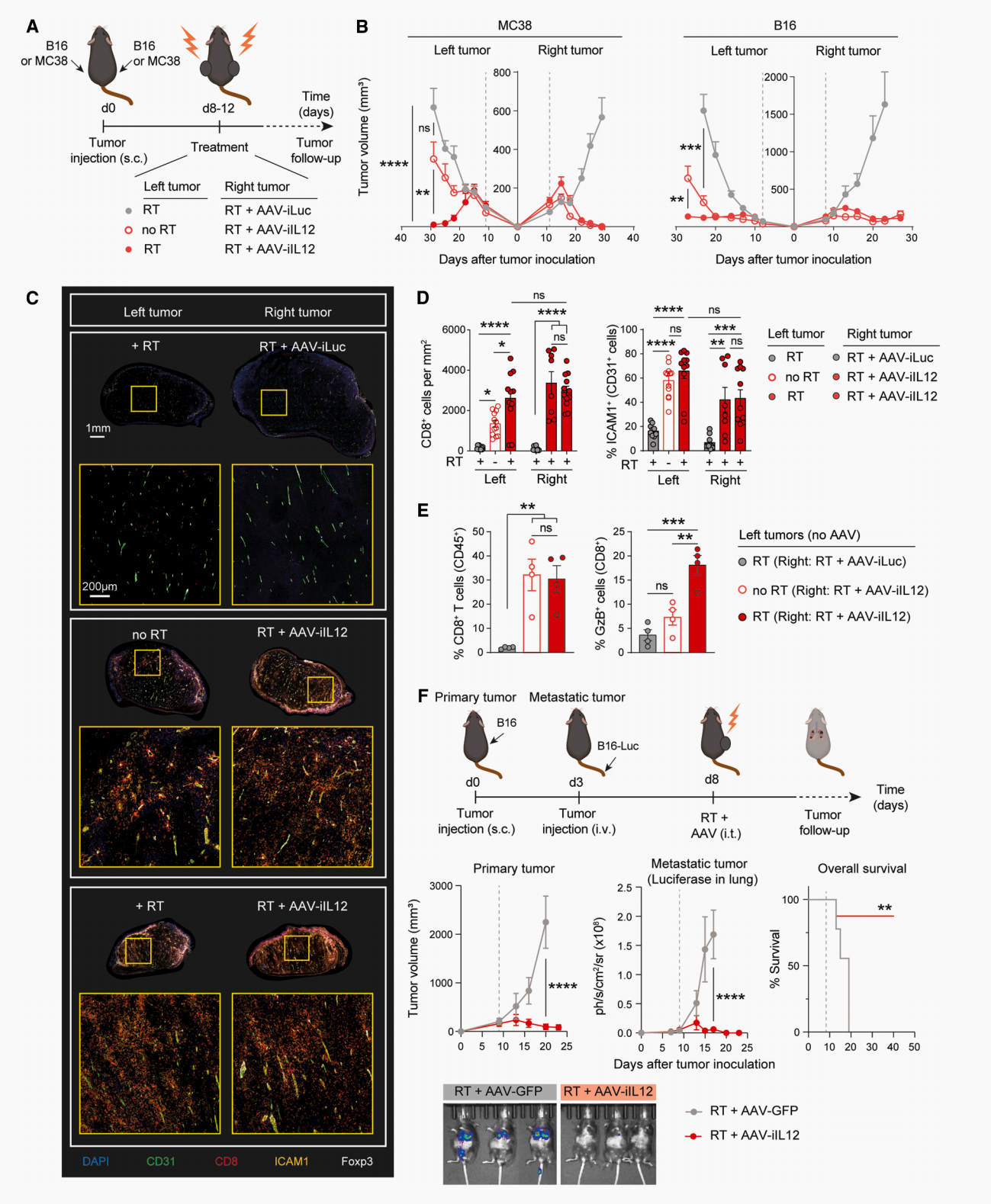 双侧肿瘤模型:仅对右侧肿瘤进行放疗+AAV-iIL12注射,左侧未放疗肿瘤中未检测到IL-12表达,证实该平台具有严格的肿瘤局部靶向性。