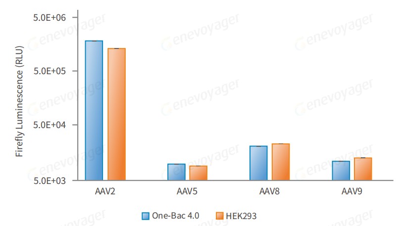 One-Bac 4.0系统与HEK293系统⽣产不同⾎清型AAV-Luc相同MOI感染HEK293细胞表达萤⽕⾍荧光素酶活性⽐较。
