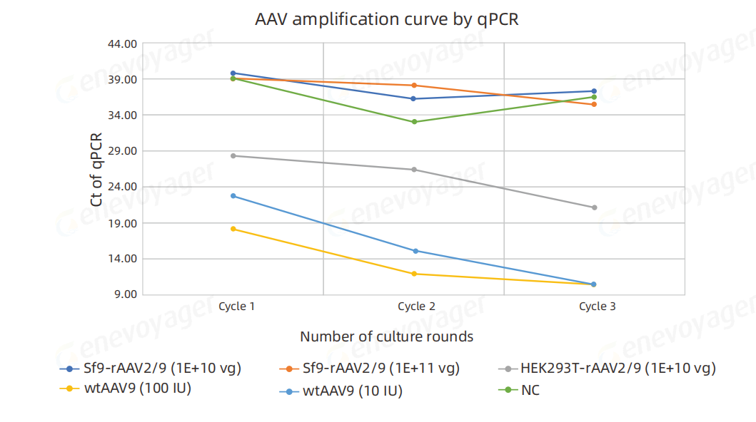 对三轮细胞培养后细胞培养液提取基因组DNA并针对rcAAV进行qPCR检测,1001U的阳性对照样品(wtAAV2/9)三轮扩增ct呈下降趋势,说明其rcAAV经过培养得到了扩增;sf9系统生产的rAAV2/9,接毒量1E+12vg,三轮扩增中ct无下降,且ct与阴性对照(NC)相近,未检测到rcAAV;HEK293系统生产的rAAV2/9,接毒量1E+10vg,三轮扩增中c也呈现下降趋势,说明其rcAAV经过培养也得到了扩增,检测到了rcAAV。