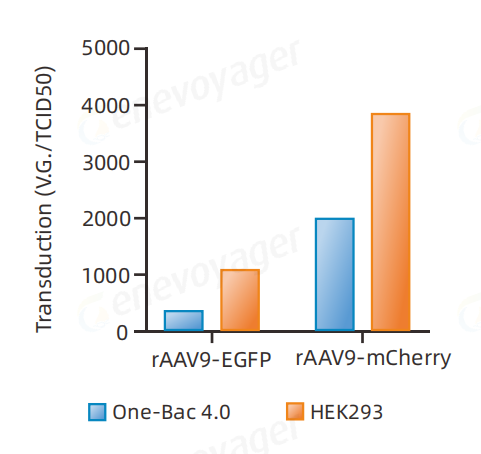 One-Bac4.0系统与HEK293系统生产rAAV9-EGFP、rAAV9-mCherry转导能力【比活:物理滴度/感染滴度(TCID5)】比较。