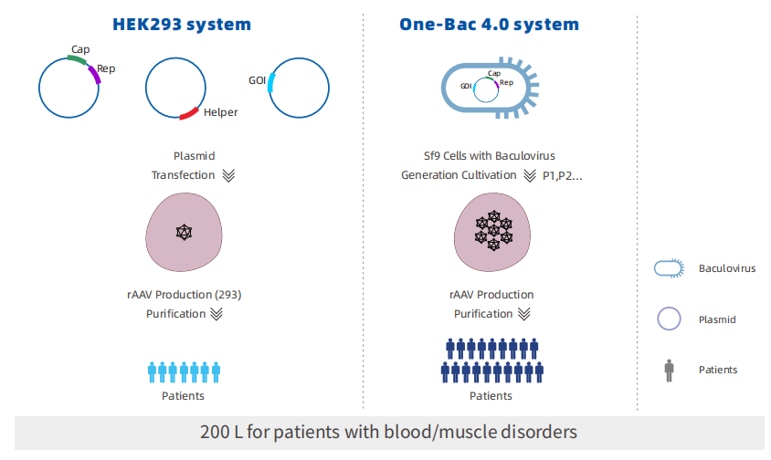 One-Bac 4.0系统作为昆虫/杆状病毒系统,其生产过程包括:杆状病毒质粒构建--种毒生产--种毒扩增--种毒感染昆虫细胞--AAV收获,几个主要部分。通过含有AAV基因组的杆状病毒感染昆虫细胞,实现生产的线性化放大,突破AAV大规模制备的壁垒。单批次产能远超其他系统,有望惠及更多病患。