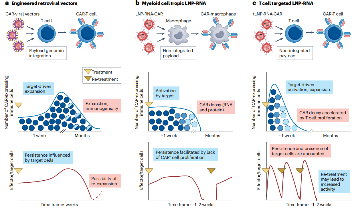 RNA-LNP平台的核心,是通过脂质纳米颗粒(LNP),将编码CAR的线性或环状RNA递送至目标免疫细胞,实现CAR的瞬时表达。这类平台的崛起,得益于COVID-19疫情期间mRNA疫苗与LNP制剂的技术突破——可电离脂质的创新,使得LNP具备高生物可降解性与低免疫原性,支持重复给药,同时通过抗体功能化或免疫嗜性设计,实现对T细胞或髓系细胞的特异性靶向。