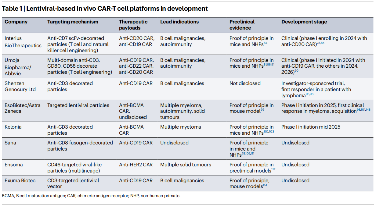 表1 基于慢病毒的体内CAR-T细胞技术平台(研发阶段)