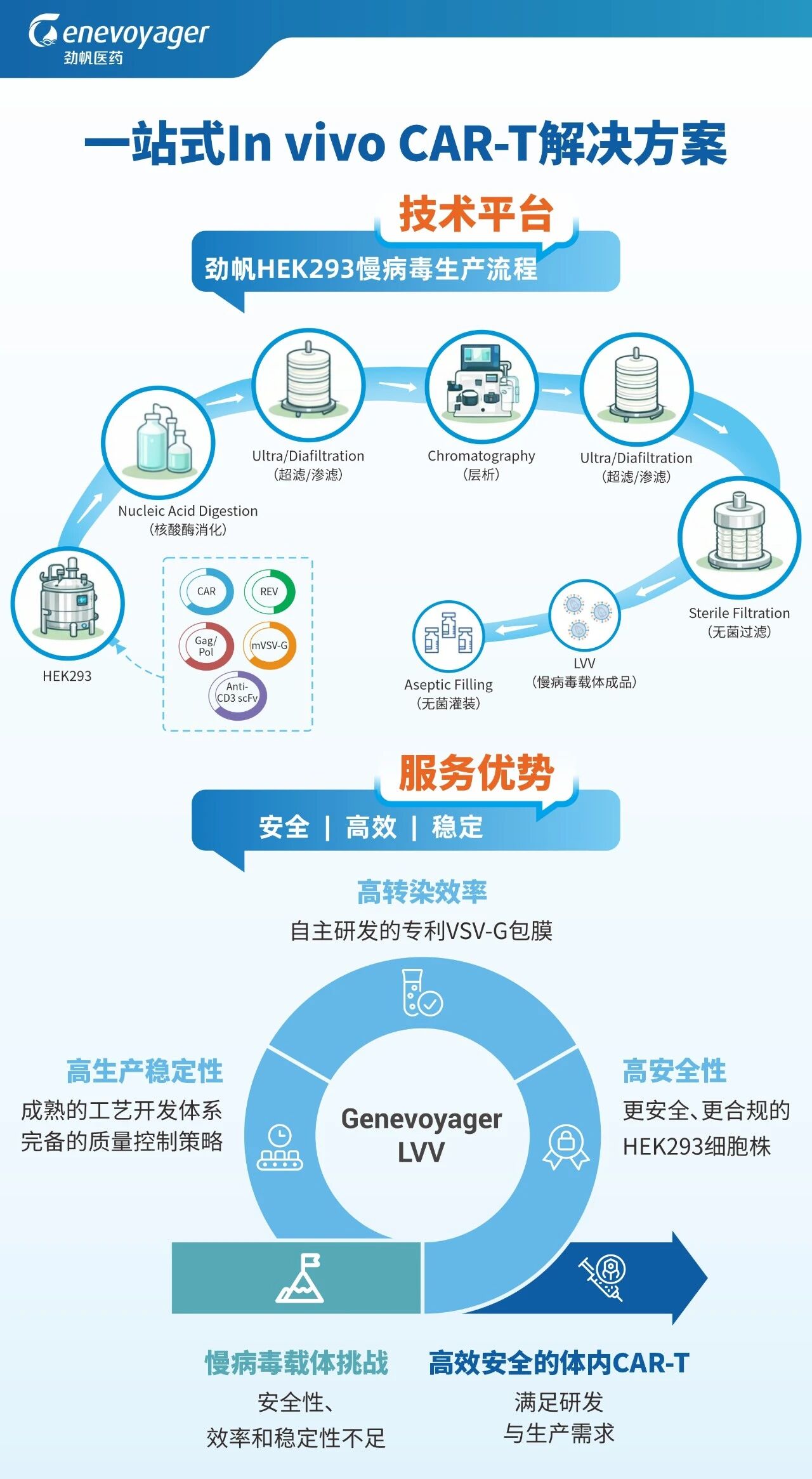 劲帆医药专注于In vivo CAR-T领域慢病毒载体CDMO全流程服务,致力于为全球细胞与基因治疗企业提供从研究级、GMP-like到商业化GMP级的一站式慢病毒开发、生产与质控解决方案。公司依托自主构建的成熟商业化悬浮慢病毒生产平台,具备完善的上游工艺开发、下游纯化、质量研究与分析检测能力,可提供非注册临床样品制备、临床及商业化产品GMP生产、IIT/IND一体化申报、分析检测与技术咨询等全链条服务,满足客户从早期研发到商业化上市的全生命周期需求。
